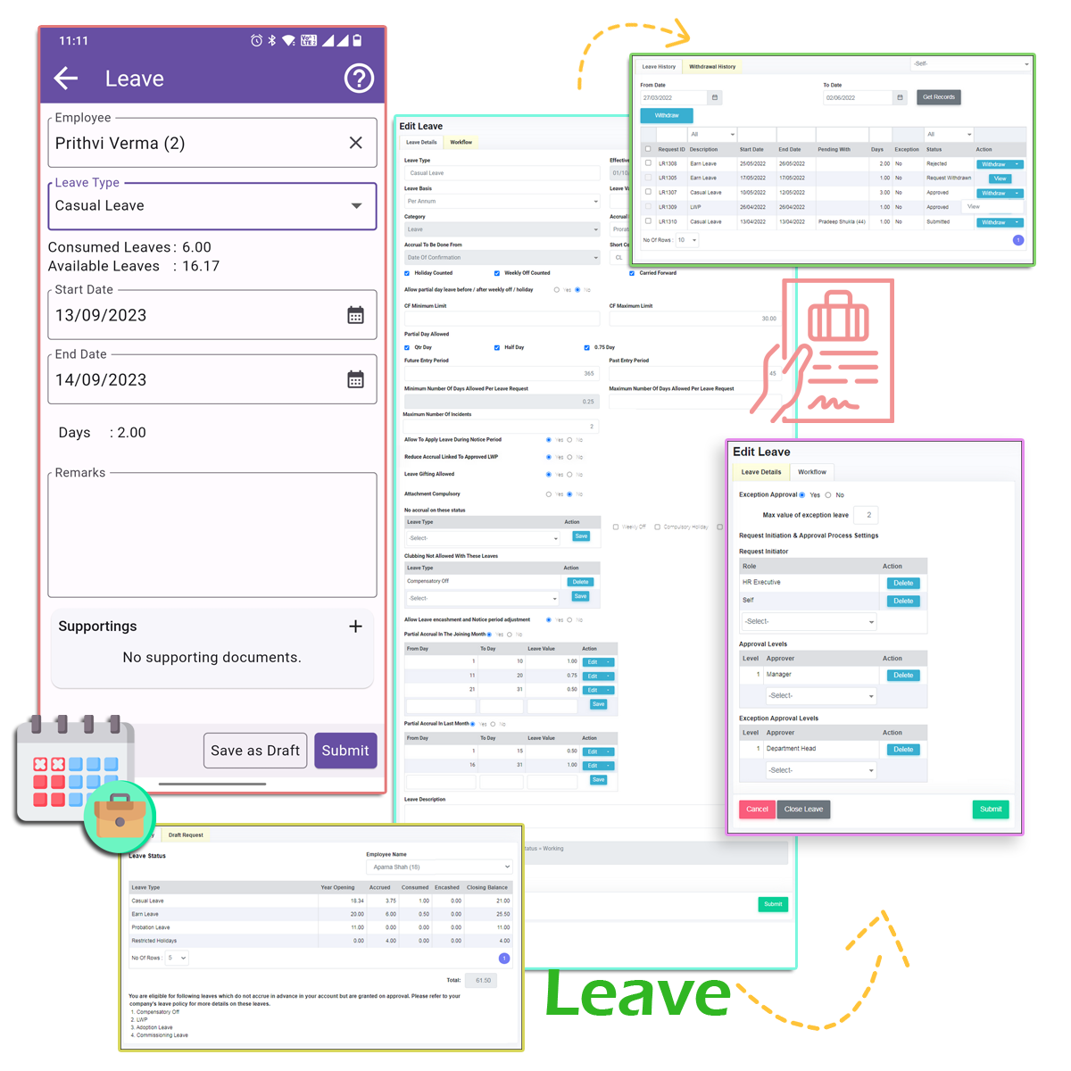 • Ensure that your company is fully compliant with Government laws by enabling system defined maternity, earn leaves and other statutory leaves.